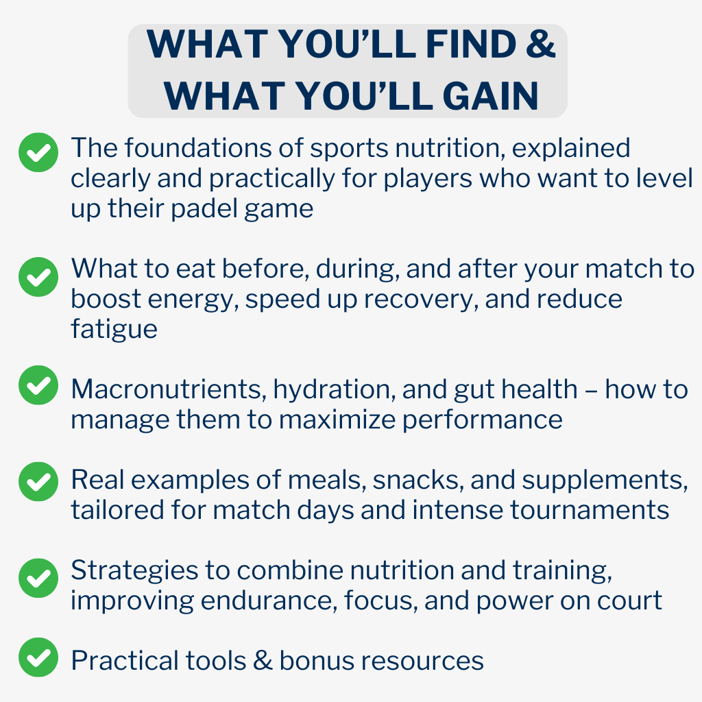 Written by an expert in sports nutrition and personal training applied to padel, this guide isn’t a generic manual: it’s a structured journey that walks you step by step through building your ideal nutrition plan, tailored to your routine, matches, and goals.